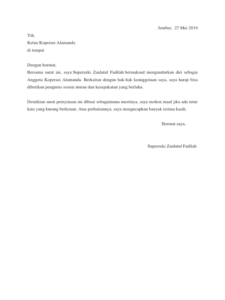 Contoh Surat Pernyataan Pengunduran Diri Dari Keanggotaan Koperasi Delinewstv