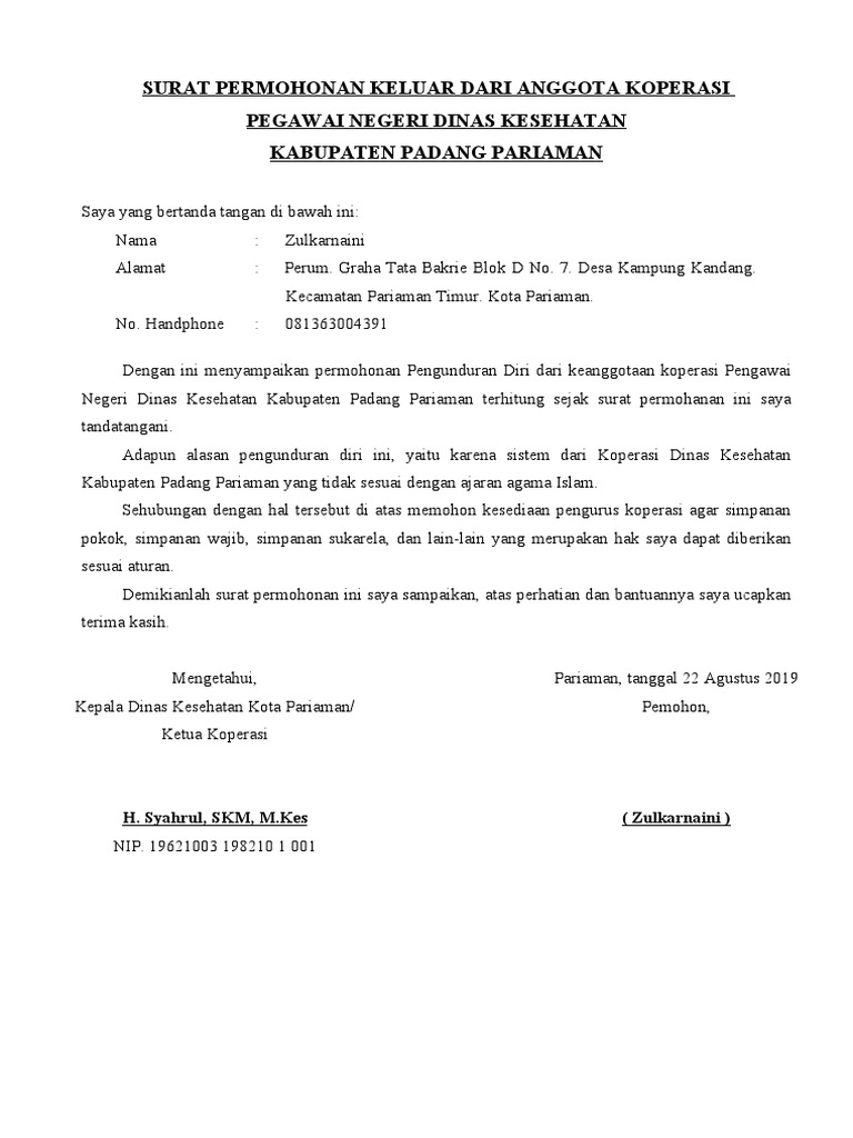 Surat Permohonan Keluar Dari Anggota Koperasi Pdf